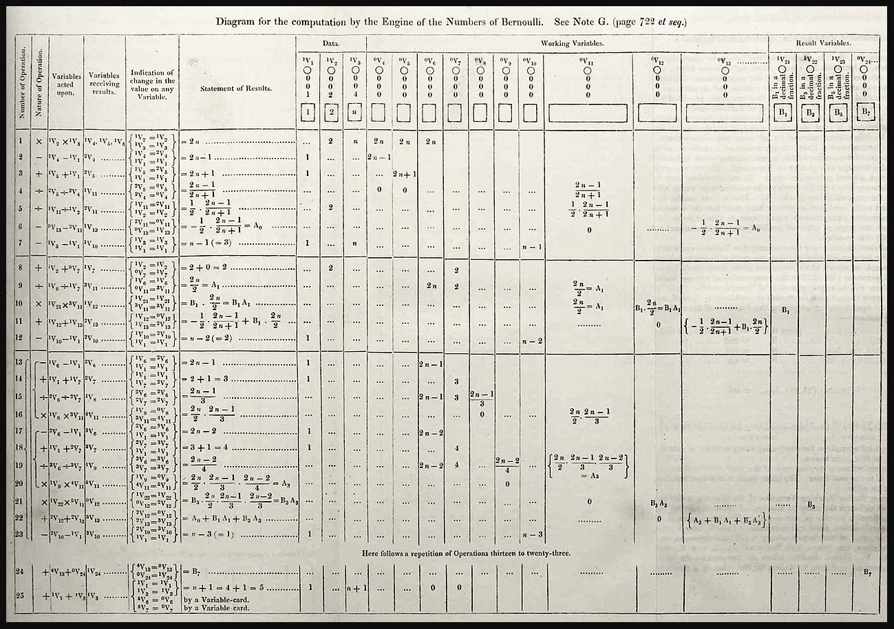 - В своих примечаниях (объёмом в три раза больше оригинальной статьи) она описала алгоритм вычисления чисел Бернулли (Note G), который считается первой компьютерной программой.