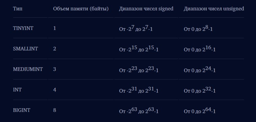Существует всего 5 основных целых типов: TINYINT, SMALLINT, MEDIUMINT, INT и BIGINT. Основным различием между ними является диапазон хранимых значений. Чем он шире, тем больше необходимо выделять памяти для его хранения. Важно правильно определять нужный тип из всех возможных, чтобы правильно распределять ресурсы памяти при создании таблицы.