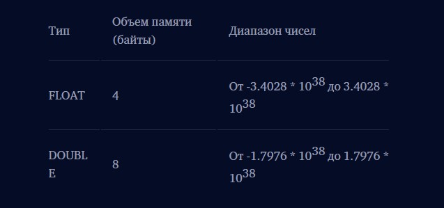 Предназначен для хранения приблизительных числовых значений. В MySQL можно определить что использовать для результирующего типа данных благодаря спецификации точности. Она не является обязательной и при необходимости указывает в скобках, как это показано ниже: