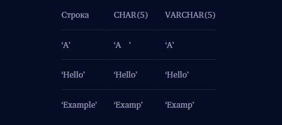 Для наглядности ниже будет представлена таблица с примерами хранения разной длины строки для CHAR(5) и VARCHAR(5).