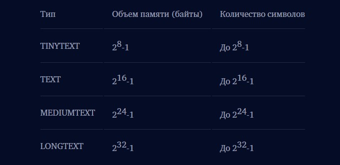 Ниже в таблице представлены все модификации типа TEXT, необходимый объем памяти для них и максимально возможное количество символов.