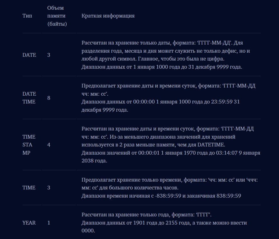 Далее будут представлены типы данных для хранения даты и времени. Ниже будет представлена таблица со всеми необходимыми данными.