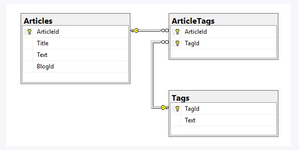 Технически мы получим две связи один-ко-многим. Столбец TagId из таблицы ArticleTags будет ссылаться на столбец TagId из таблицы Tags. А столбец ArticleId из таблицы ArticleTags будет ссылаться на столбец ArticleId из таблицы Articles. То есть столбцы TagId и ArticleId в таблице ArticleTags представляют составной первичный ключ и одновременно являются внешними ключами для связи с таблицами Articles и Tags.